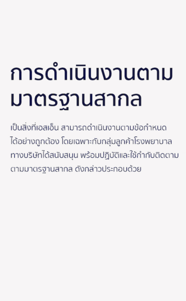 รูปแบบการเตรียมเอกสาร การปฏิบัติงานในงานบริการด้านต่างๆ เพื่อรองรับมาตรฐานสากลเป็นสิ่งที่เอสเอ็นเข้าใจและสามารถดำเนินงานตามข้อกำหนดได้อย่างถูกต้อง โดยเฉพาะกับกลุ่มลูกค้าโรงพยาบาล ทางบริษัทได้สนับสนุน พร้อมปฏิบัติและใช้กำกับติดตาม ตามมาตรฐานสากล ดังกล่าวประกอบด้วย